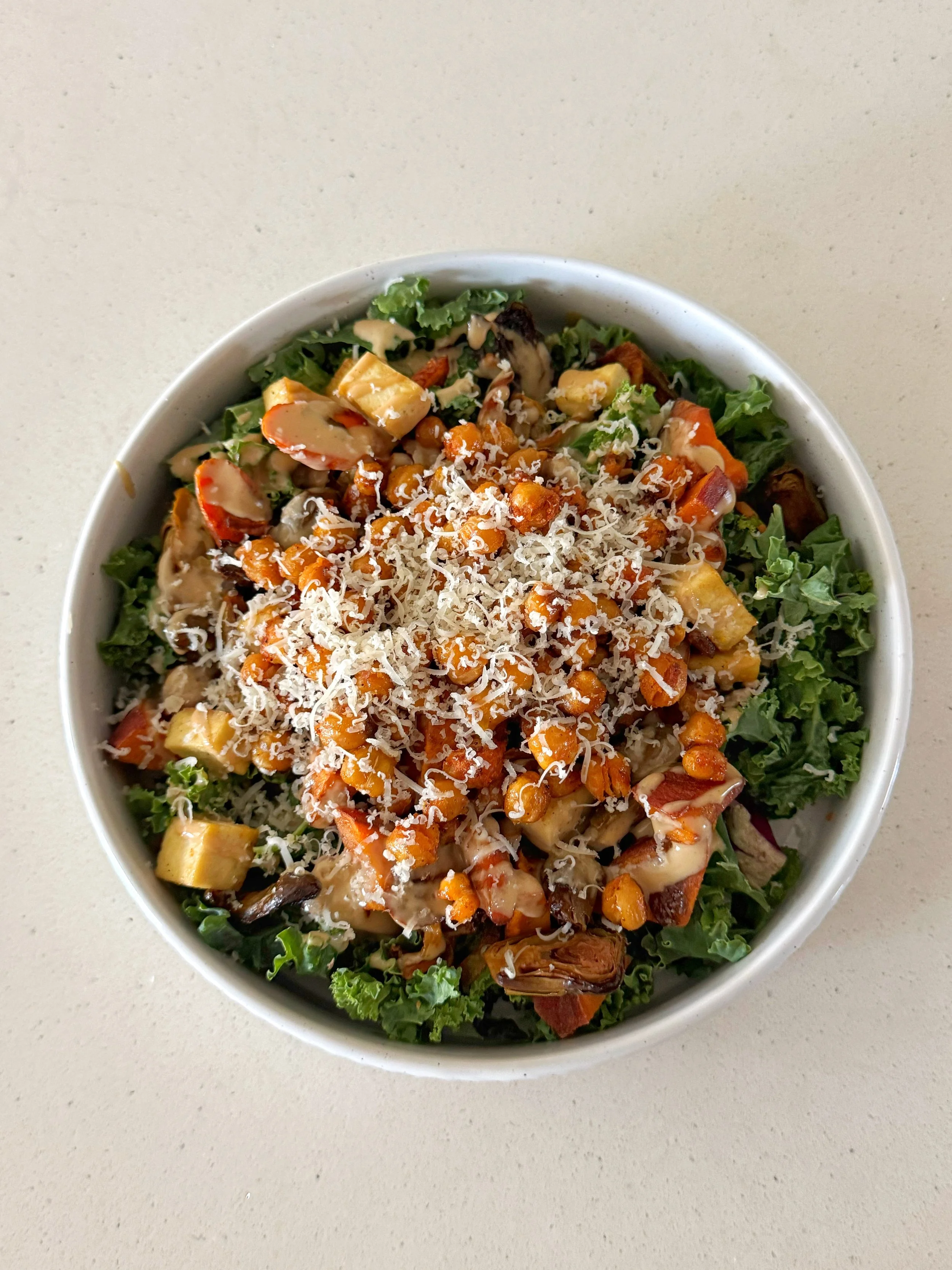5. Assemble the salad: Remove the veggies from the oven. Assemble your salad by topping the roasted veggies and roasted chickpeas over the kale then drizzle with Caesar dressing and toss gently to combine.