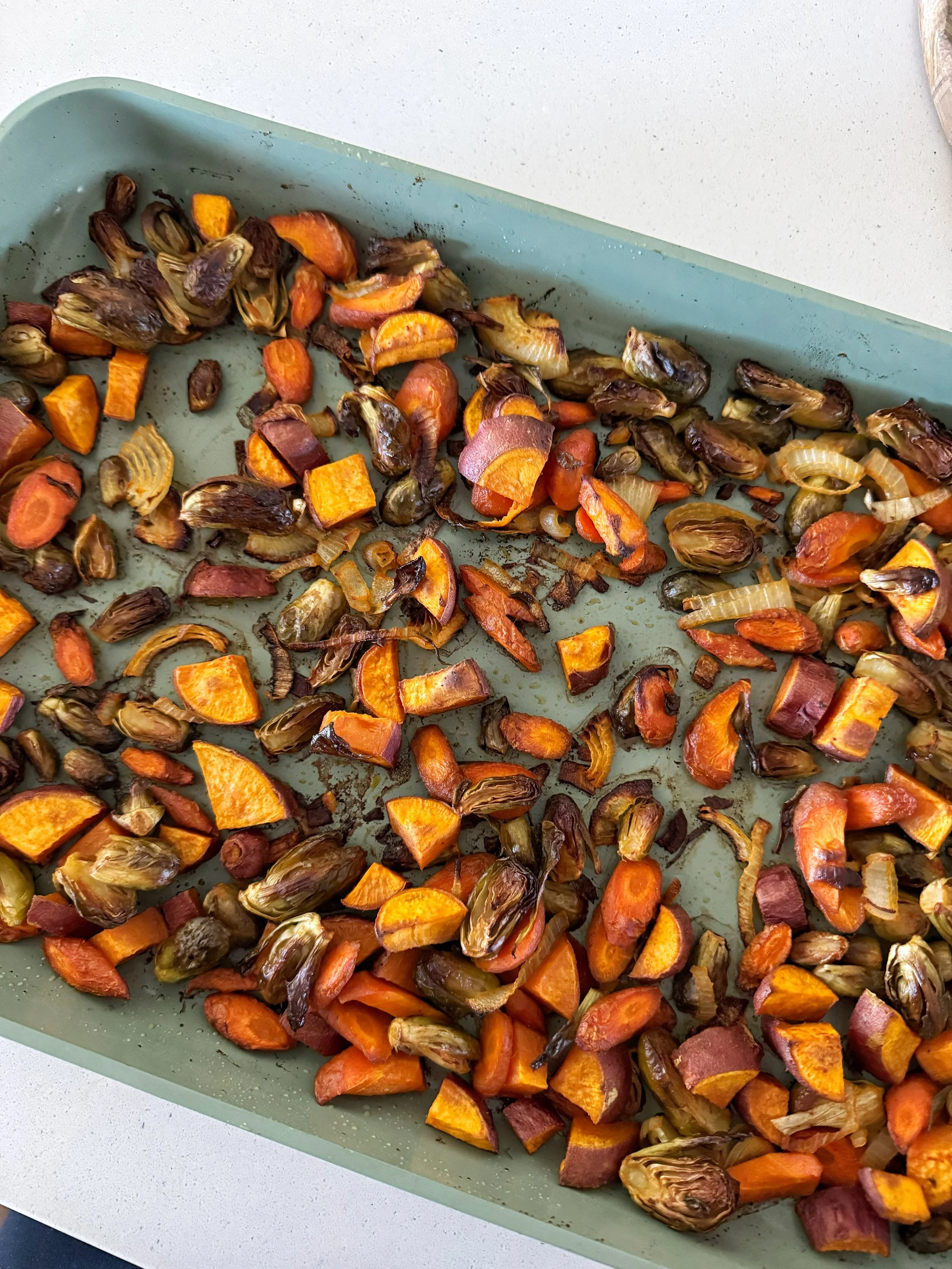 3. Roast: Spread veggies into an even layer and roast for 25–30 minutes, until tender and golden brown on the edges.
