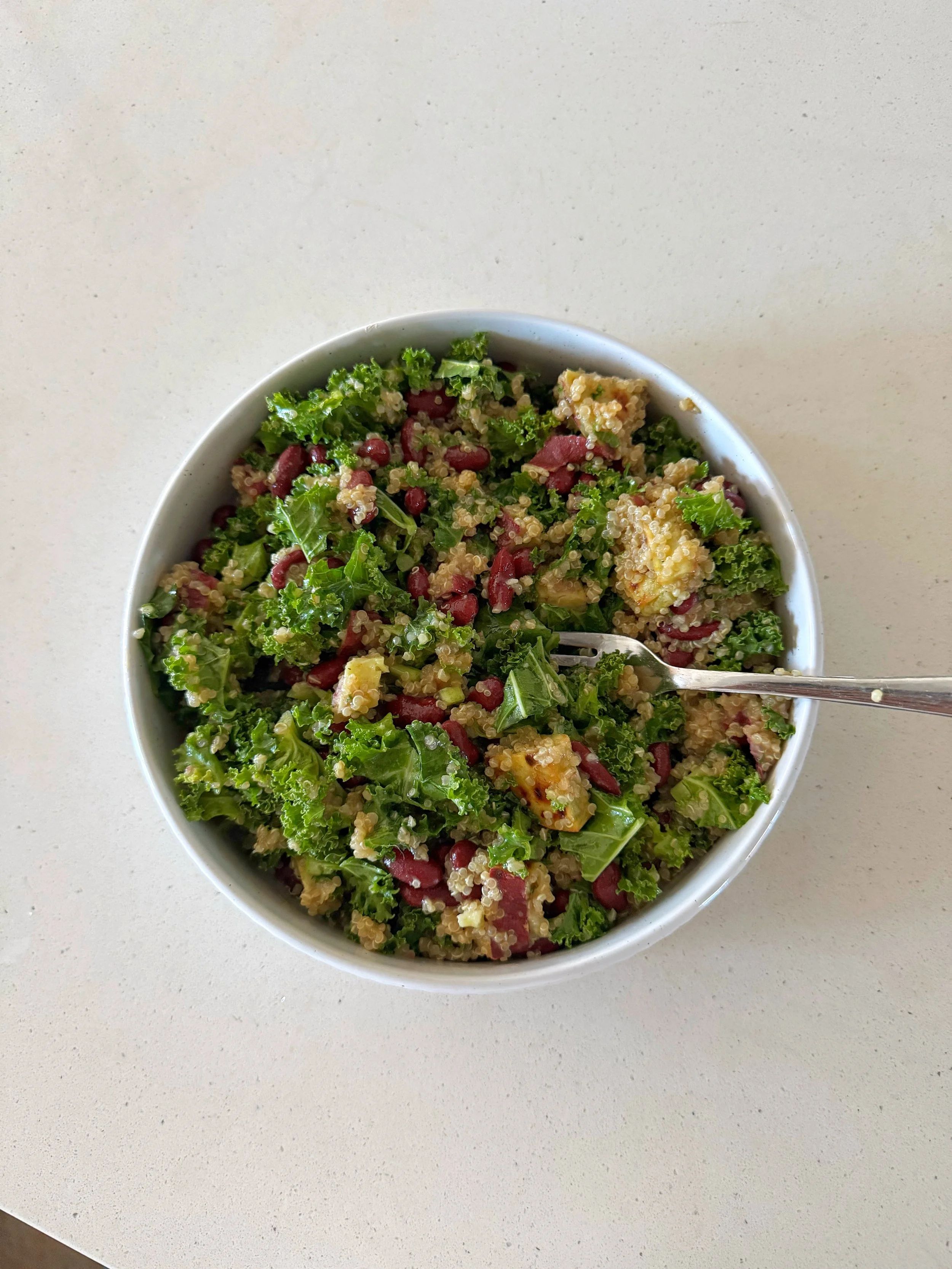 This is one of those meals that checks every box: easy to prep, nutrient-dense, and totally satisfying. The combination of roasted Japanese sweet potatoes, quinoa, kale, and kidney beans creates a satisfying grounding base, while the apple cider vinaigrette adds the flavor.