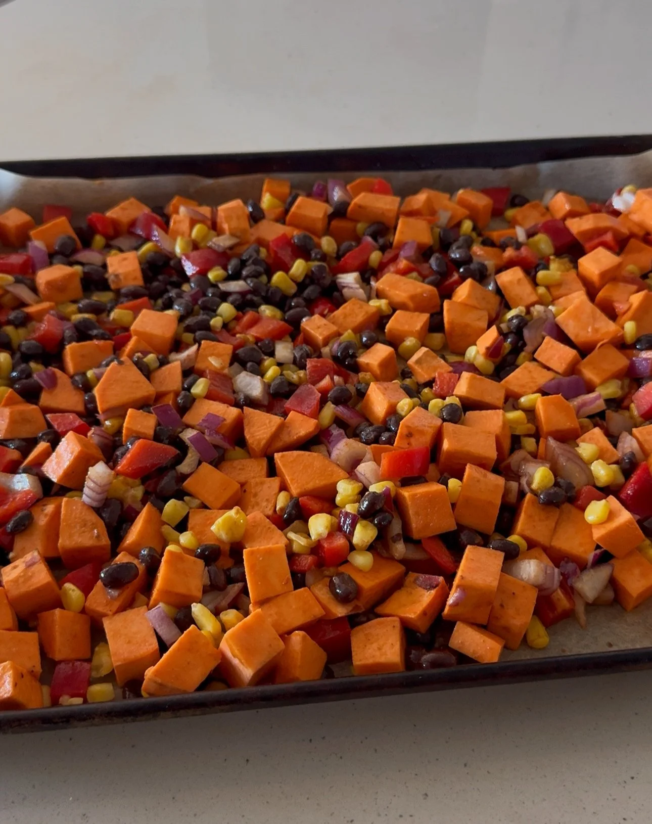 2. Add the sweet potato, bell pepper, black beans, corn, onion, salt, pepper, garlic powder, chili powder, paprika, ground cumin and oil to the baking sheet. Toss and place in the oven for 25 minutes or until the sweet potatoes are cooked through.