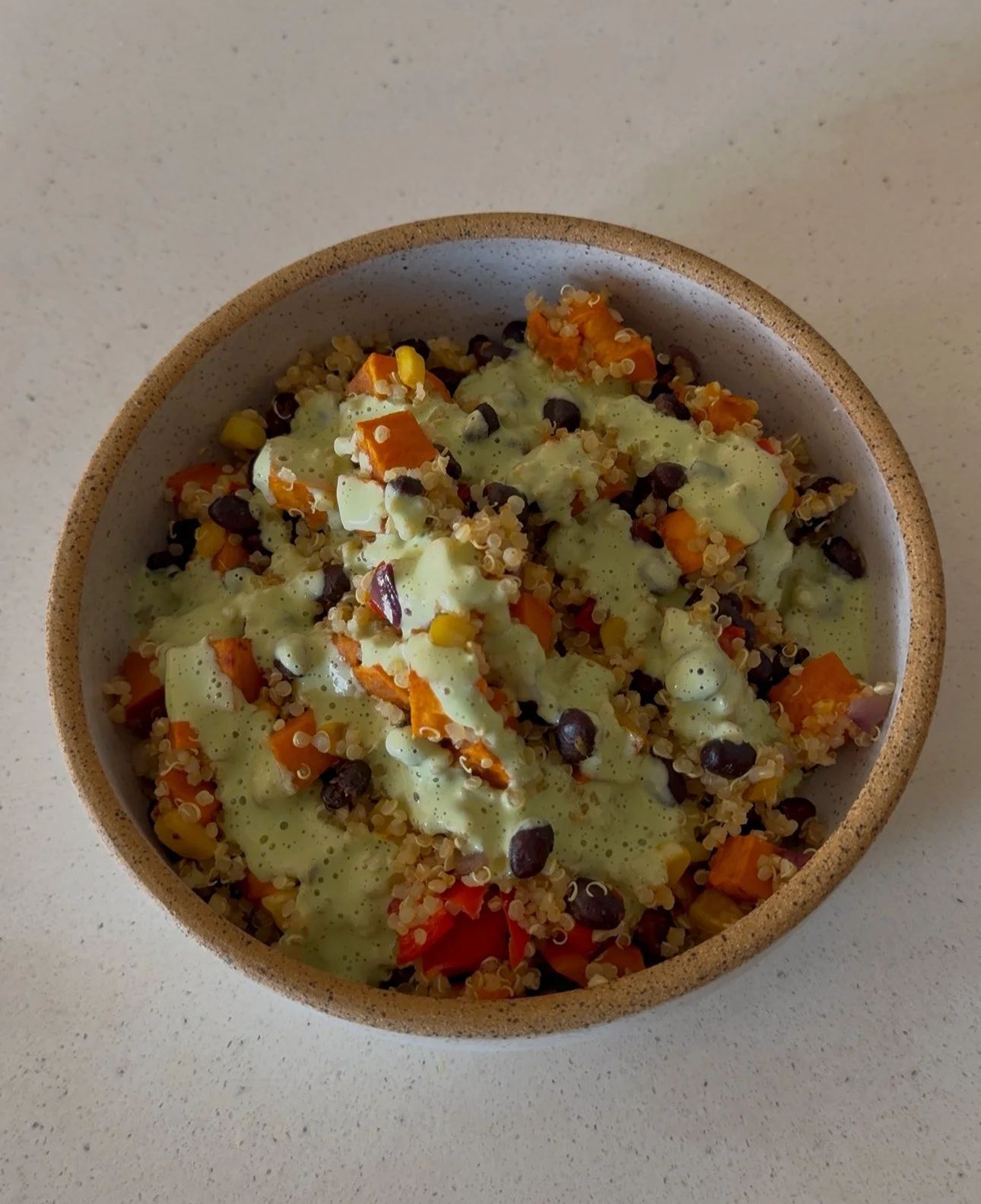5. Assemble your bowl with the quinoa and roasted veggie mix and top with the dressing. Toss until well combined. Top with your additional ingredients. Enjoy!