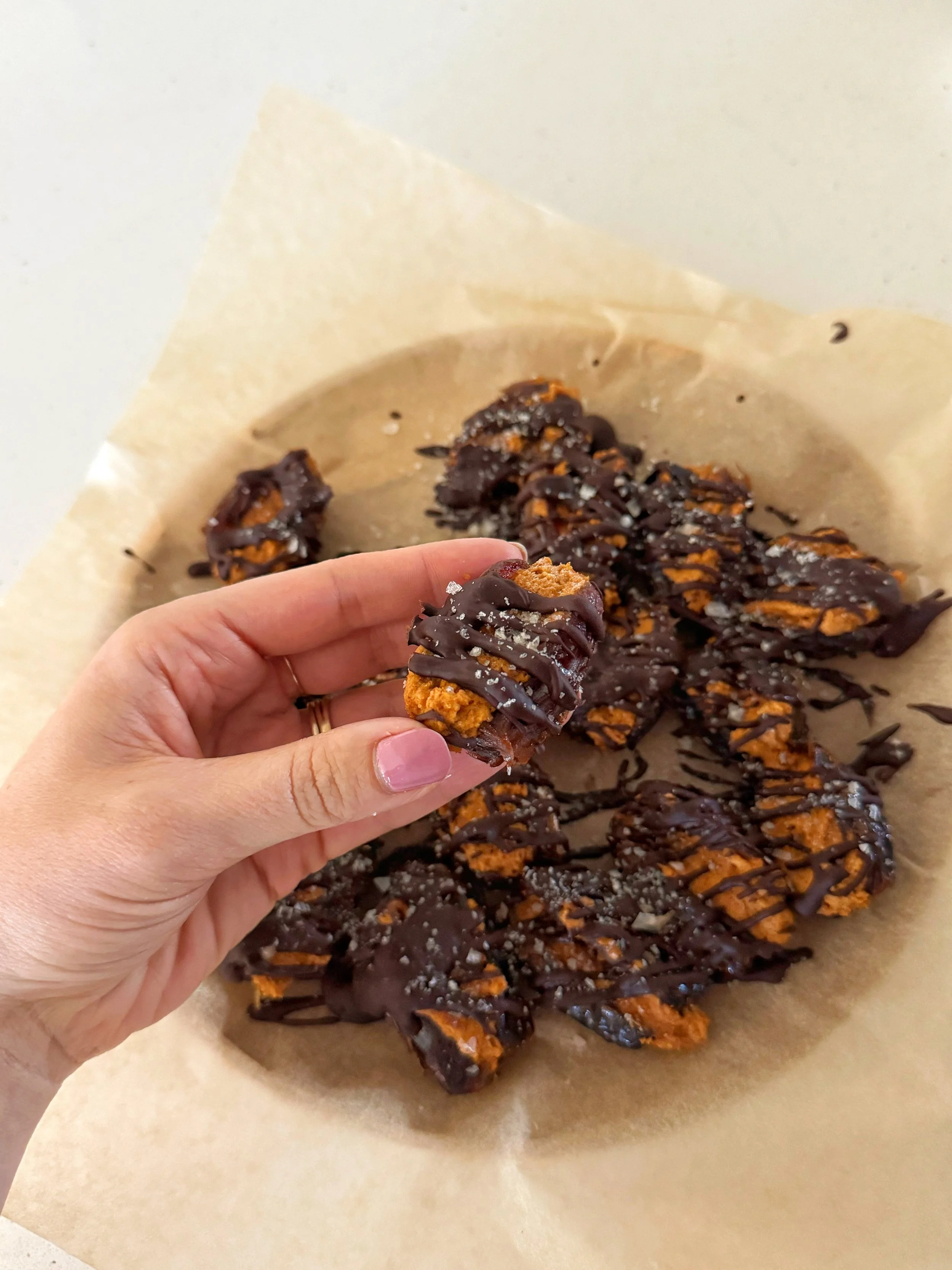 Begin by prepping the filling by mixing the almond butter, pumpkin puree, and pumpkin pie spice in a bowl until smooth and creamy. Then begin filling the dates by scooping about 1 1/2 tsp of the pumpkin mixture into each halved date. Place each date on a parchment paper covered plate. Place in the freezer for about 30 minutes. Meanwhile, melt the chocolate by combining the chocolate chips and coconut oil in a small bowl. Microwave in 20-second bursts, stirring until smooth. You can also melt it over low heat in a pot on the stove top- just be sure to whisk as it melts and remove from heat immediately after melting to prevent burning. Then remove the dates from the freezer. Drizzle the chocolate over the dates. Option to top with flaky sea salt! Pop back in the freezer for a few minutes before serving. Store in the freezer in an airtight container then let them thaw a few minutes before consuming.